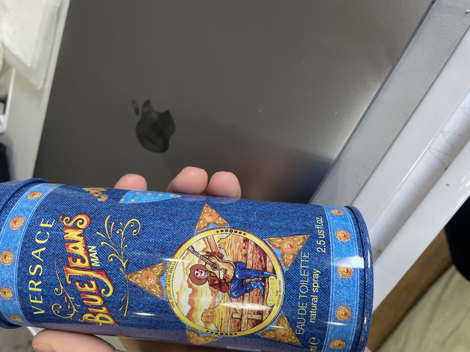 - "The image displays a human hand holding a blue cylindrical tin, identified as "VERSACE Blue Jeans MAN Eau de Toilette natural spray, 75 ml / 2" by FM-KyBIz2, licensed under CC BY 4.0