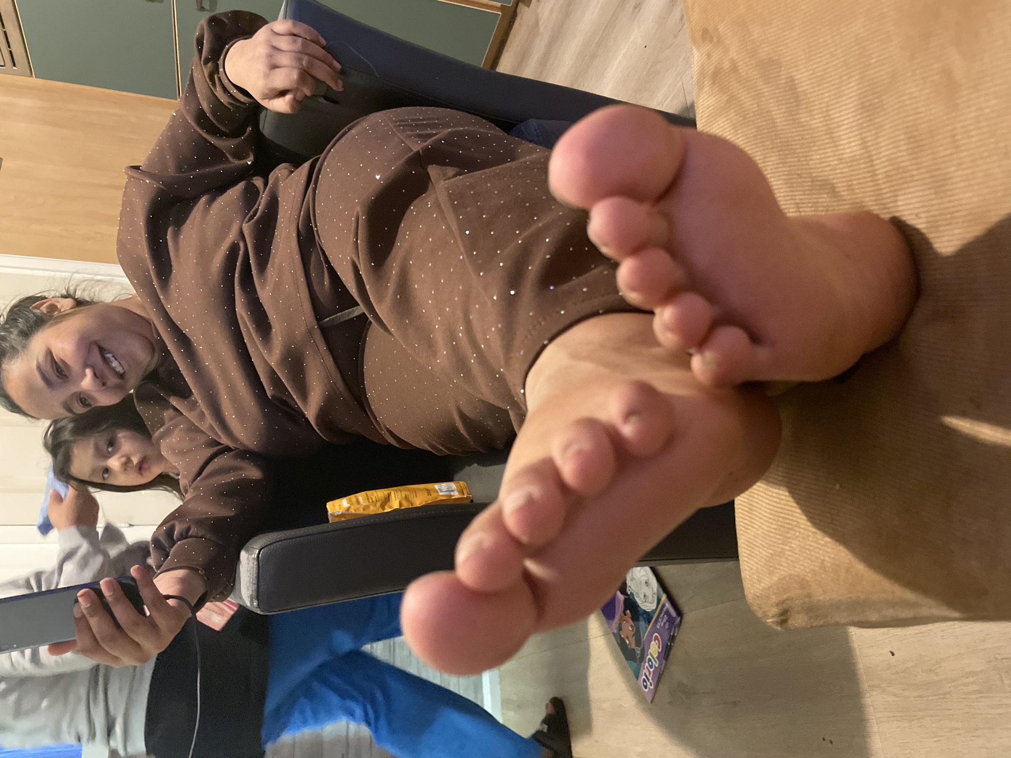 An indoor residential scene in Dronten, Netherlands, depicts three individuals. In the foreground, the bare feet of an adult female rest on a beige, ribbed upholstered footrest. This female, estimated to be in her 30s-40s, is seated in a dark upholstered armchair, wearing a brown long-sleeved top and matching pants, both embellished with small white dots. She smiles broadly, looking towards the camera, while holding a dark smartphone in her left hand, positioned as if capturing a photograph or video. An orange snack bag is partially visible next to her right armrest. Behind the adult female and to her left, a young female child, approximately 4-7 years old, with dark hair, observes with a neutral expression. Partially visible behind the child and to the left is a third individual, gender undetermined, wearing light blue pants and a grey top. This individual is actively interacting with the child's head area, holding a light blue cloth. The flooring is light-colored, possibly wood or laminate. A small, colorful book titled "Colorio" lies on the floor to the left of the footrest. The background features a light-colored wall, a wooden panel or door, and a dark green cabinet. The precise location within Dronten cannot be identified from the visual data.