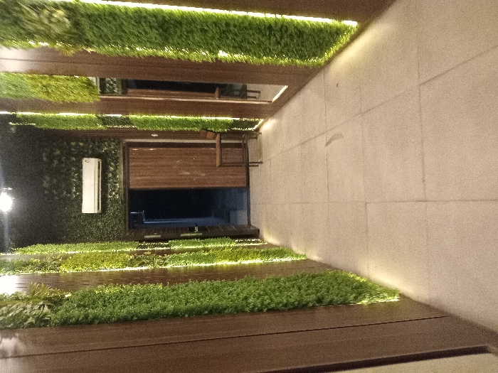 The image displays an indoor hallway or corridor within an unspecified building in Unknown, Unknown. The hallway features a light-colored, tiled floor with large square sections. The walls are constructed with alternating vertical panels of dark brown wood and dense, artificial green foliage. Each foliage panel is illuminated by a concealed vertical strip of warm white LED lighting along its lower edge, casting light upwards. The ceiling is dark and appears to be covered with similar artificial green foliage, containing one visible circular light fixture. At the far end of the hallway, a doorway is visible, consisting of two dark brown wooden panels. The left panel is partially ajar, revealing a darkened interior space beyond, while the right panel is closed. Directly above this doorway, a white split-system air conditioning unit is mounted on the foliage-covered wall. To the right of the doorway, a single, dark brown wooden high stool or chair is positioned against the wall. No individuals are present in the scene, and no actions or interactions are depicted. The environment is static, characterized by artificial illumination and a decorative scheme combining wood and artificial plant elements.