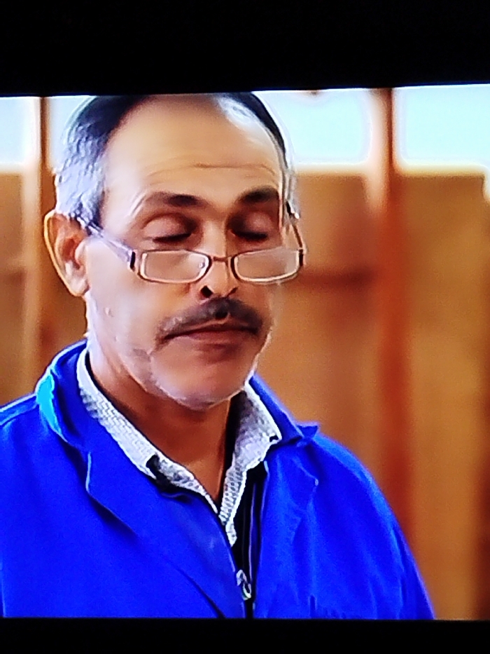 A close-up, chest-up image features an adult male, appearing middle-aged or older, with fair skin, short grey hair, and a receding hairline. He wears clear-framed eyeglasses positioned on the bridge of his nose, with his eyes closed or deeply squinted. A prominent dark mustache and visible stubble on his chin are present. He is attired in a royal blue work jacket, worn over a white and black patterned collared shirt. The background is intentionally blurred, displaying warm hues of light brown and orange, indicating an indoor setting potentially featuring wooden surfaces or architectural components. No discernible visual information is present within the image to identify its specific location within the city of Meknes, Morocco. The man's facial expression is neutral, with his lips pressed together.