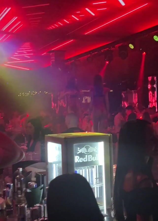 The scene takes place in a dimly lit nightclub, with red neon lights accentuating the ceiling. The club is crowded with people, many of whom are seated at tables. Two women in revealing outfits dance on top of a Red Bull cooler, their bodies visible above the crowd. The view is from behind a bar, with bottles and glasses visible in the foreground. The word "SPIRIT" is subtly visible in the background. The general atmosphere is lively and energetic, indicative of a nightclub environment.