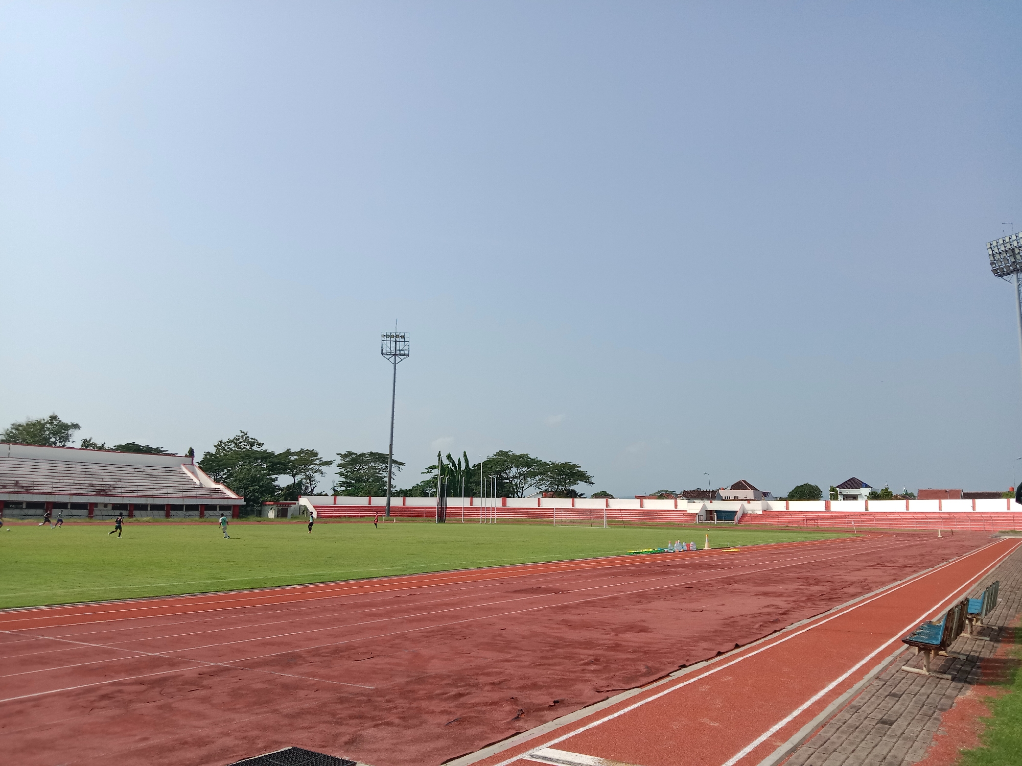 sports stadium in Kendal, Indonesia. The foreground is a red running track with white lane markers. Beyond the track is a green field, where several individuals are engaged in sports activities. The background includes stadium seating, a tall light tower, trees, and buildings under a clear sky.