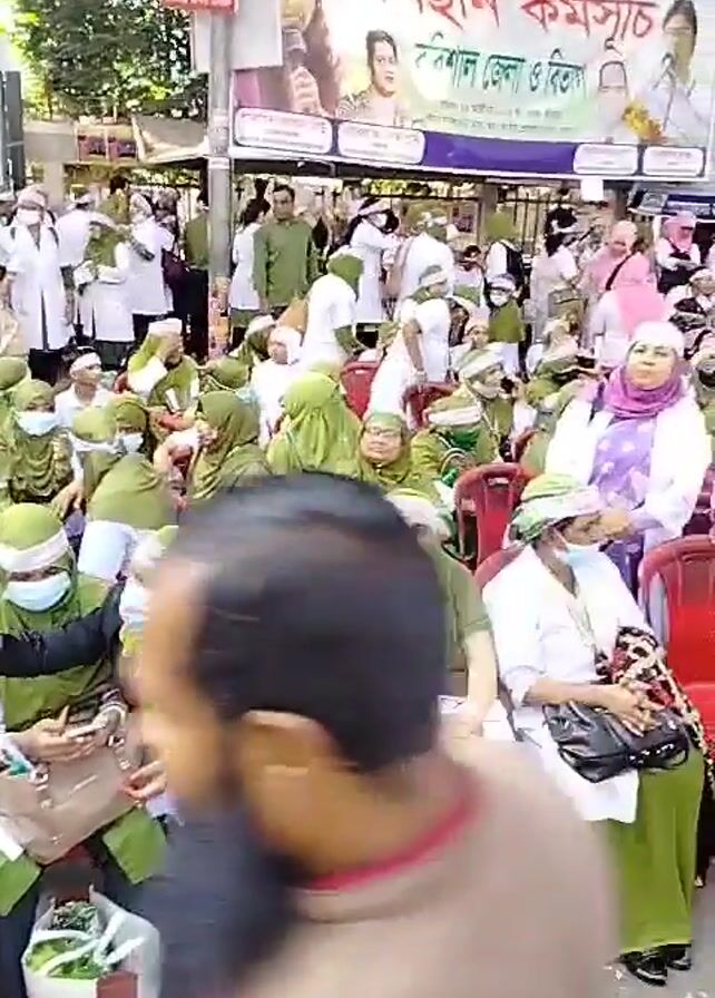 large gathering of people, mostly women, seated in red plastic chairs outdoors. Many are wearing green head coverings and vests or green tops, along with face masks. Some are dressed in white coats. Banners with Bengali text and images of people are visible in the background, suggesting the event is a demonstration or protest. The setting appears to be a public area, possibly a park or a street, with trees and buildings in the background. Some people are looking at the camera, while others are engaged in conversations or looking around. The camera moves slightly, providing a wider view of the crowd.