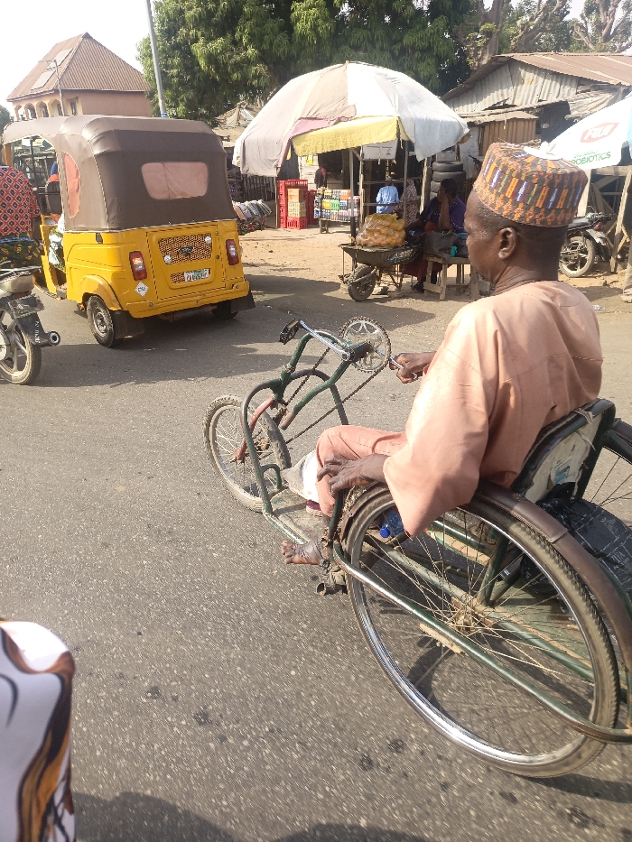The image depicts a bustling street in Alizaga, Nigeria, under bright daylight. In the foreground, an individual, appearing to be an adult male, is operating a custom-built, hand-powered tricycle. He is seated in the device, which features a green metallic frame, a single front wheel, and two larger rear wheels, propelled by hand cranks. He wears a light-colored tunic and a patterned cap. His bare feet are visible, resting on the tricycle's frame. To the left, a yellow Keke Napep (auto-rickshaw) with a brown fabric roof is visible, displaying a Nigerian license plate "ABJ 650 UF" on its rear. Part of a motorcycle's rear wheel and exhaust pipe is visible between the tricycle and the Keke Napep. The road surface is asphalt. In the midground and background, a vibrant street market is set up with multiple vendors and pedestrians. Large white umbrellas provide shade over stalls displaying various goods, including a handcart piled with produce (possibly oranges) and stacked red plastic crates. Rustic structures with corrugated metal roofs and a larger building with a brown tiled roof are visible beyond the market activity. Trees and foliage are present above the market stalls.