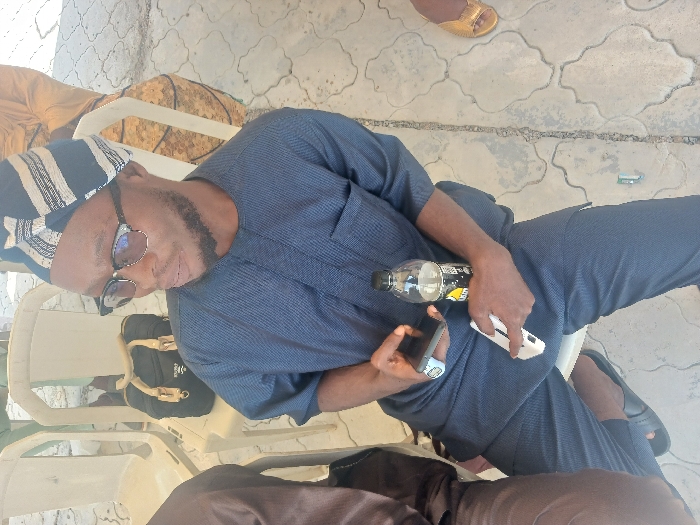 This image depicts an outdoor scene in the city of Otite, Nigeria. The central figure is an adult male, seated on a white plastic chair. He wears a navy blue traditional Nigerian kaftan-style outfit, a black and white striped cap, and black-framed glasses, with a visible short beard. He holds a black smartphone in his left hand. His right hand grasps a clear plastic bottle with a black cap and a yellow-on-black label, and a white rectangular electronic device positioned beneath the bottle. He wears black slippers. To his left, a black shoulder bag with brown straps rests on an adjacent white plastic chair. A second individual is partially visible to his right, wearing patterned brown and gold fabric and a gold sandal. The ground is paved with light-colored, interlocking concrete blocks. A dark cable lies on the paved surface near the primary subject's feet.