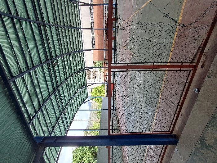 A covered outdoor sports court, possibly for basketball or volleyball, features a green corrugated metal roof supported by a dark blue steel frame. A rusty, red-framed chain-link fence lines one side of the court, beyond which are trees, a distant mountain, and buildings. The court itself is a mixture of red, green, and yellow colors with visible lines. The image is taken from an unusual angle, looking upwards and slightly sideways towards the court.