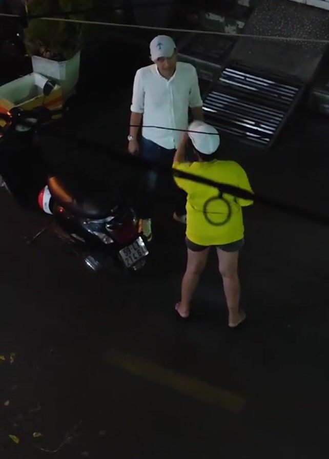 two people in an outdoor setting at night. One person is wearing a white button-down shirt, jeans, and a white baseball cap. The second person is wearing a bright yellow t-shirt with a symbol on the back, dark shorts, and a white baseball cap. They are both standing near a black motorcycle. The person in the yellow shirt is pointing their finger at the person in the white shirt. The background includes a white fence, greenery, and a metal grate. The ground appears to be asphalt with yellow painted lines.