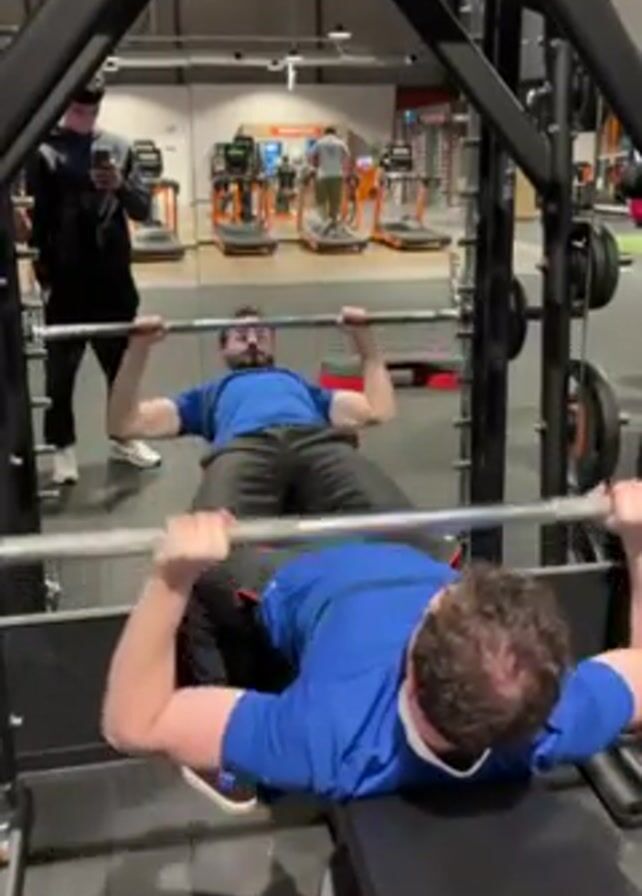 person performing a bench press exercise in a gym. The person is lying on a bench within a black metal frame, lifting a barbell. The person is wearing a blue t-shirt and dark pants. In the background, a mirror reflects the scene, showing another person standing and holding a phone, possibly filming the exercise. Other gym equipment, including treadmills, is visible in the background. The gym has gray tiled flooring and bright overhead lighting.