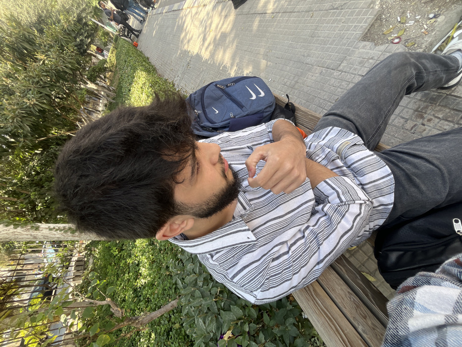 - "A young adult male is depicted seated on a wooden park bench within Al-Qanawat Municipality, Syria, under bright daylight conditions" by FM-WnN6r1, licensed under CC BY 4.0