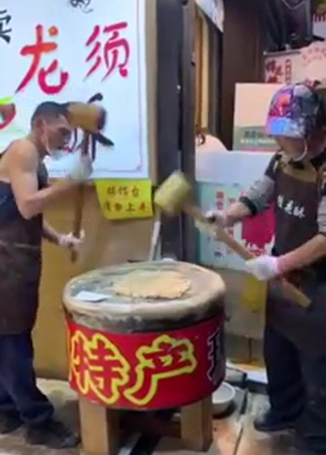 Two people stand on either side of a drum-like contraption, each holding a large mallet. The person on the left wears a tank top and the person on the right wears a long-sleeved shirt and a hat. They are both wearing aprons and gloves. They are repeatedly striking the top surface of the drum with their mallets in a rhythmic fashion. The drum is decorated with Chinese characters in red and yellow. Behind them is a wall with signs also written in Chinese. The scene appears to be taking place outdoors, possibly in a market.