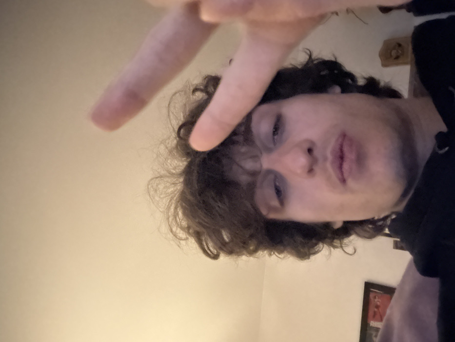 A person with curly dark hair makes a peace sign. The camera angle is low, pointed upwards. The person's face is visible, showing their eyes, nose, and mouth with slightly parted lips. A section of an interior wall can be seen at the top left, and a framed picture partially in view at the bottom right. The person wears a dark hoodie or shirt.