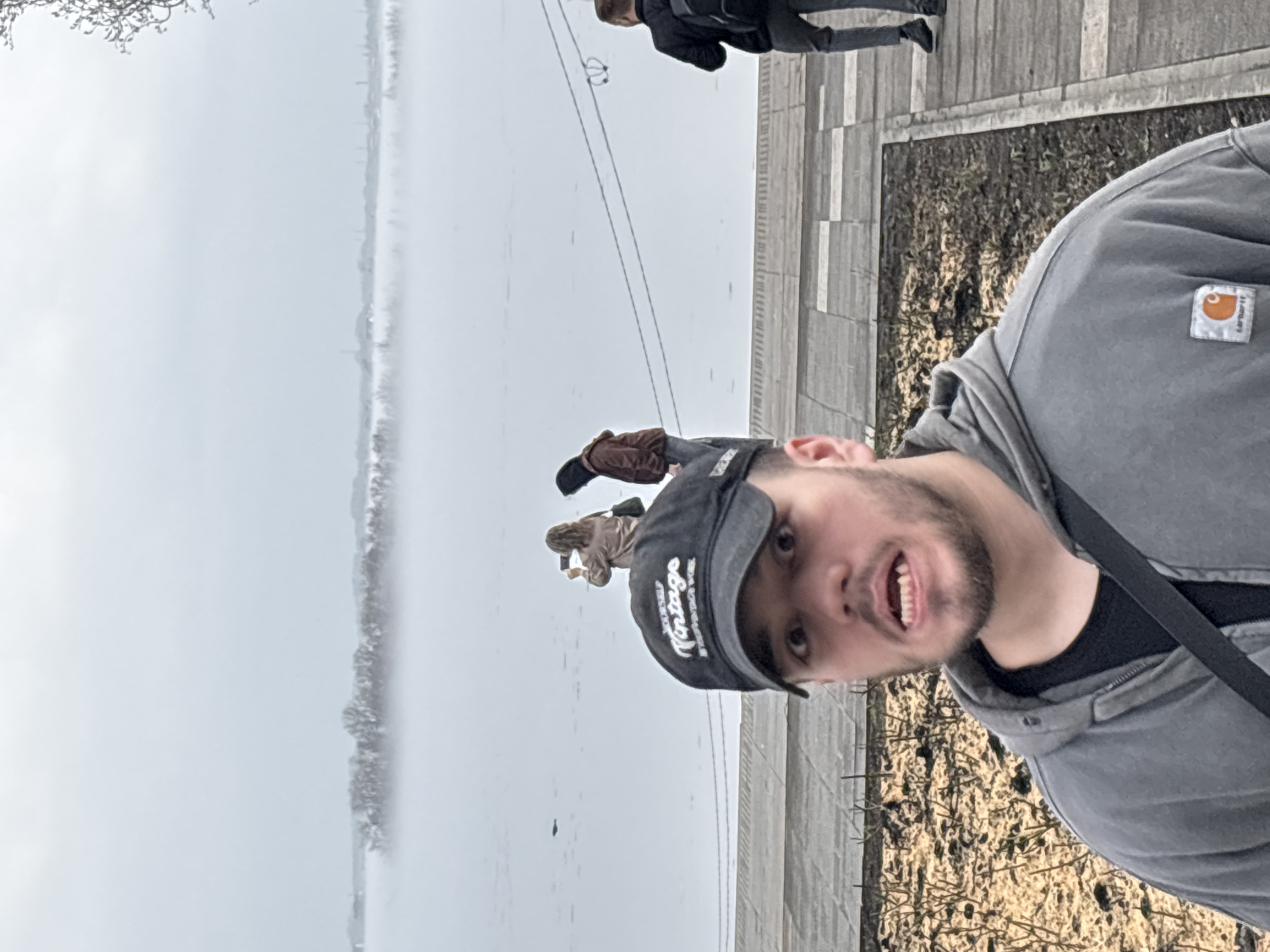 A selfie of a young man with a beard and a baseball cap, wearing a gray hooded sweatshirt, is taken on a cloudy day in Saratov, Russia. In the background are the foggy waters of the Volga River, with hints of the city skyline obscured by the fog. Several people are walking along the promenade next to the river. The promenade surface is a mixture of gray concrete and some brown foliage in the planter boxes. A wire, possibly from an overhead light or trolley system, runs along the length of the promenade.