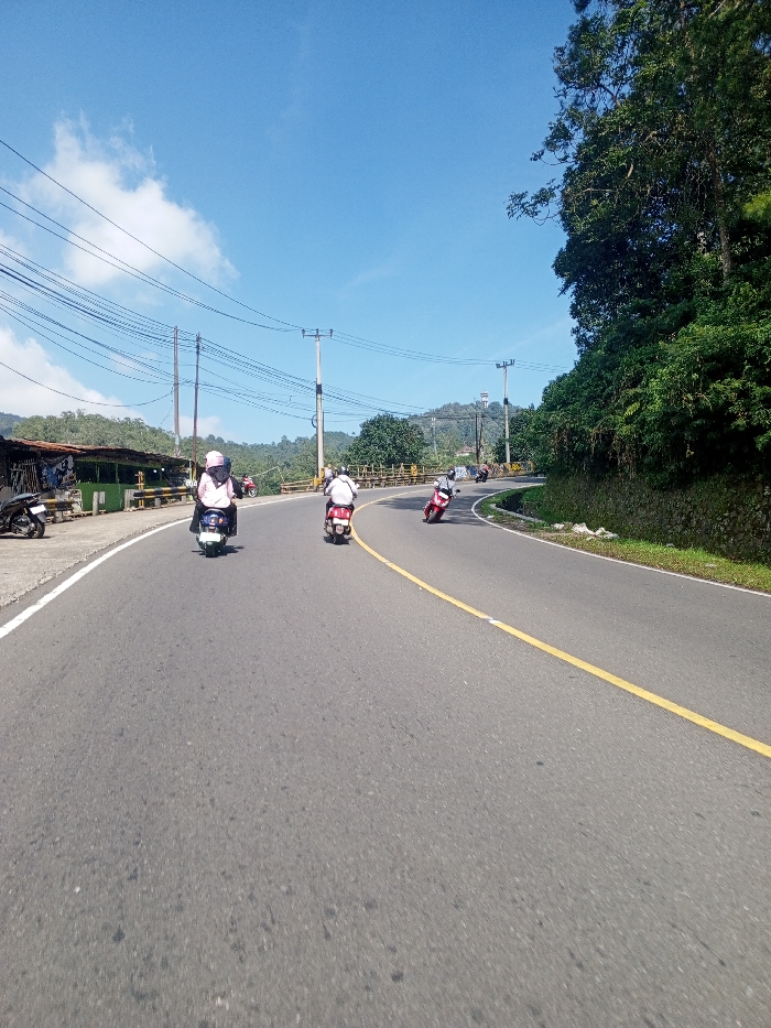 The scene depicts a paved asphalt road in Multhan, India, under a clear blue sky with scattered white clouds. The road features a solid yellow center line and a solid white line marking the left shoulder, curving gradually to the right and ascending into the distance. Three motor scooters are visible on the road, all traveling away from the camera. In the left lane, a rider on a white scooter wears a light-colored top and helmet. To their right, a second rider on a light-colored scooter wears a white top and helmet. Further ahead and to the right, a third rider on a red scooter leans into the curve. Other dark-colored scooters are visible further down the road, and one dark-colored scooter is parked on the concrete shoulder to the far left. To the left of the road, a long, low structure with a dark roof and light-colored walls, possibly roadside stalls or shops, is visible. Multiple utility poles carrying power lines run parallel to the road on this side. To the right, a steep bank is densely covered with green trees and bushes. In the background, forested hills rise, with a white tower structure visible on a distant peak. The scene is brightly illuminated by natural daylight.