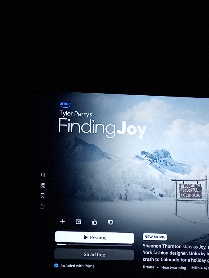 The image displays a photograph of a digital screen, likely a television, captured at a slight angle in a dimly lit indoor environment. The screen is presenting content from Amazon Prime Video. The central subject on the screen is the title card for "Tyler Perry's Finding Joy," with the Amazon Prime logo positioned above the title. The background image for this title features a wide, panoramic view of a snowy, mountainous landscape under an overcast sky. Several snow-covered evergreen trees are visible, and a rustic wooden sign on the lower right reads "WELCOME TO COLORFUL COLORADO." Various user interface elements are present around the title and background. On the far left, a vertical navigation bar displays icons for search, a grid-view (browse), a bookmark (watchlist), and a shopping cart. Below the central image, a horizontal row of icons includes a plus symbol (add), a film reel (share), a thumbs-up (like), and a thumbs-down (dislike). A prominent white button with a play symbol is labeled "Resume," situated above a darker button stating "Go ad free." Below these, a blue checkmark indicates "Included with Prime." To the lower right, additional information about the movie is displayed, including a "NEW MOVIE" tag. Partially visible text describes the plot: "Shannon Thornton stars as Joy, a York fashion designer. Unlucky in crush to Colorado for a holiday g". Genre classifications "Drama" and "Heartwarming" are listed, along with an "IMDb 4.4/10" rating. The image itself contains no specific visual cues to identify its physical location in Royton, United Kingdom. The content depicted on the screen refers to a fictional setting in "Colorado," not Royton, UK.