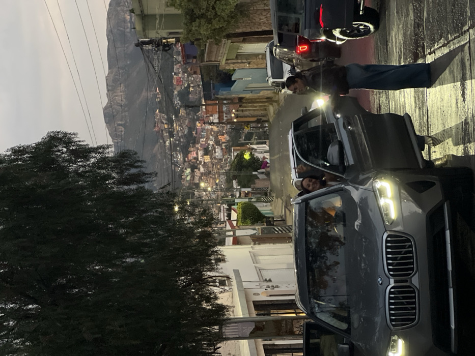 This image captures an urban street scene at twilight in Guanajuato City, Mexico. In the foreground, a dark grey BMW X3 SUV is stationary on a wet asphalt street, facing the viewer at a slight angle, with its headlights active. The front passenger door is open. A female occupant is seated inside, smiling and gesturing with her raised right hand towards the camera. A second female subject is partially depicted exiting the open passenger door, wearing a dark jacket and blue wide-leg jeans, with her right leg visible on the pavement. A third female subject stands immediately to the right of the vehicle, also in a dark jacket and blue jeans, facing towards the SUV. The street, lined with residential structures, descends into a valley. The midground and background reveal a densely packed cityscape of colorful buildings, illuminated by numerous streetlights and interior lights, extending up surrounding hillsides. A rugged mountain range is visible on the distant horizon beneath a pale, overcast sky. Utility lines are present overhead. Additional vehicles, including a white car and a dark pickup truck, are parked or stopped further down the street. A large tree with dark, dense foliage partially obstructs the upper left portion of the frame.