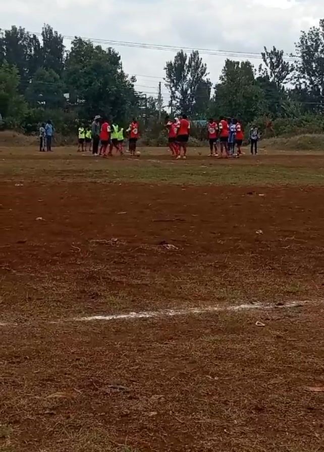 soccer team in red uniforms in the middle of a reddish-brown, dirt soccer field with some green grass. There is a white line marking one side of the field. A few people in neon green vests are scattered among them. There are other people standing on the side of the field, presumably watching. The background consists of a line of trees under a cloudy sky.