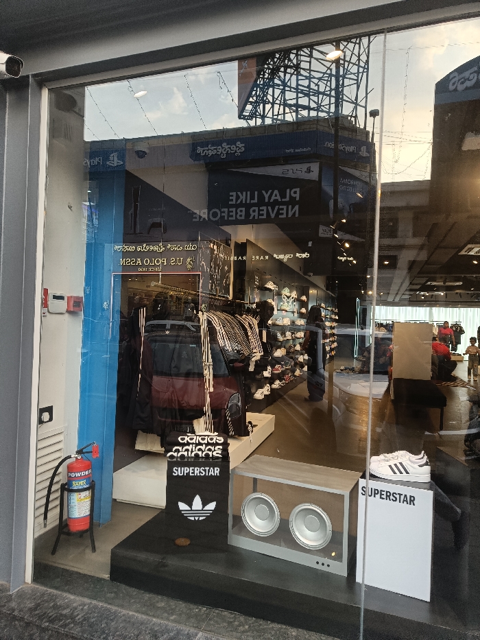 storefront of an Adidas store in Bengaluru, India. The store's front window displays a variety of Adidas sneakers, including the Superstar line. There is a red car partially visible in the background. A fire extinguisher is located on the ground in front of the window. The window is also reflecting the surrounding environment, including the street and other buildings. The store is located at latitude: 12.974, longitude: 77.607, in Bengaluru, India.