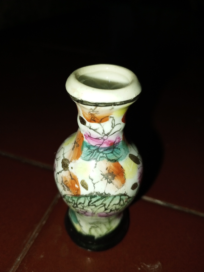- "A small, decorative ceramic vase is depicted standing on a dark reddish-brown tiled surface in Longmiang, Laos" by FM-zVPRH2, licensed under CC BY 4.0