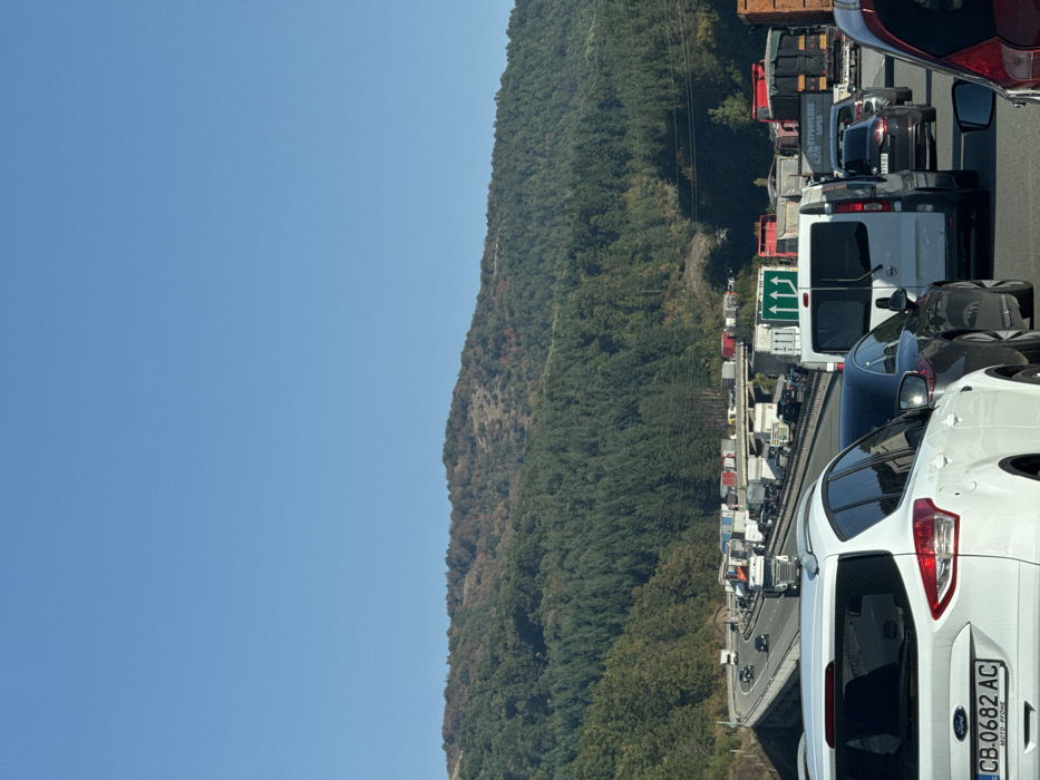 The image depicts a substantial daytime traffic congestion on a multi-lane highway near Golemo Buchino, Bulgaria