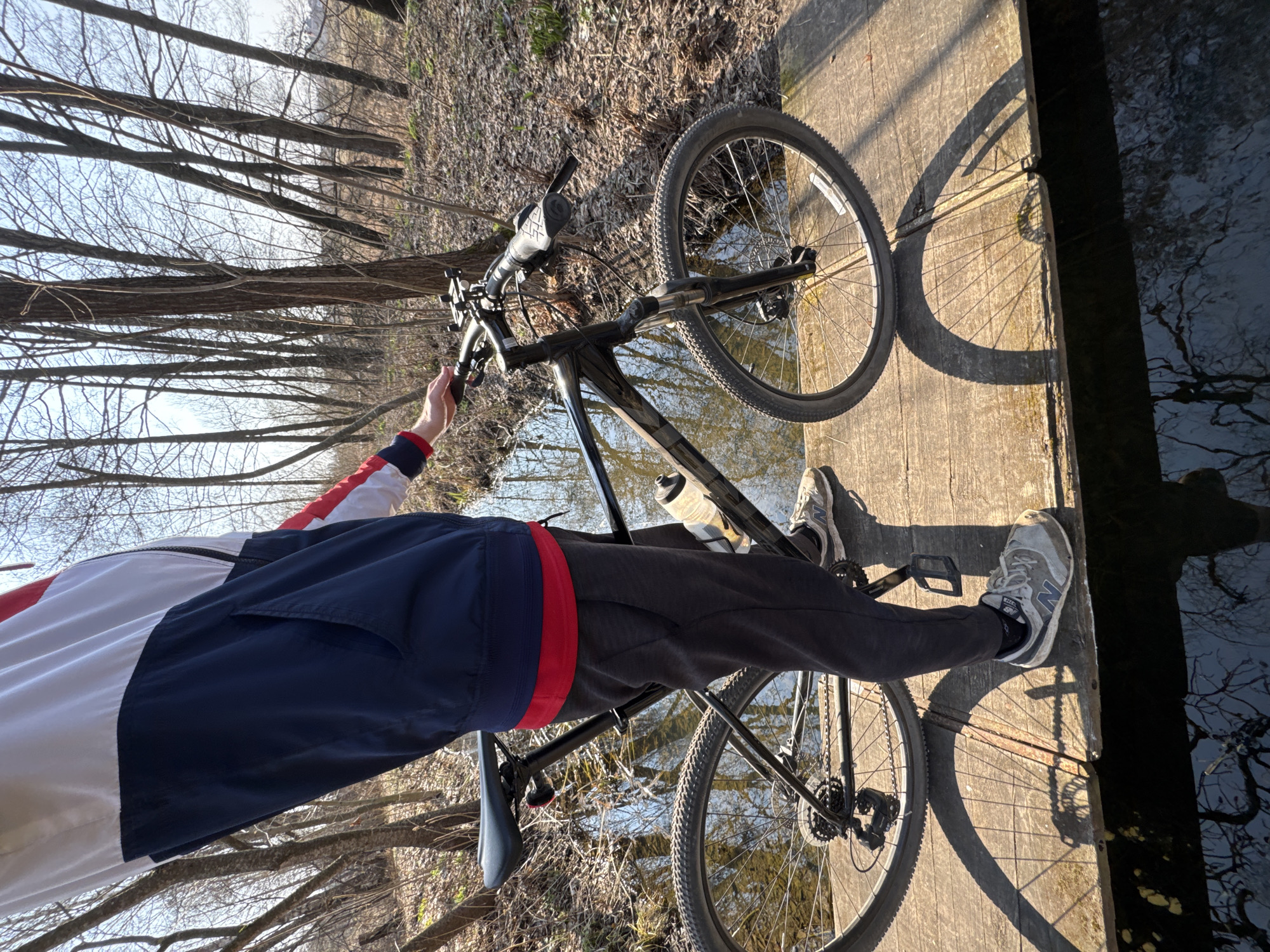 An individual is depicted from the upper chest downward, standing with a bicycle on a wooden plank bridge spanning a narrow watercourse