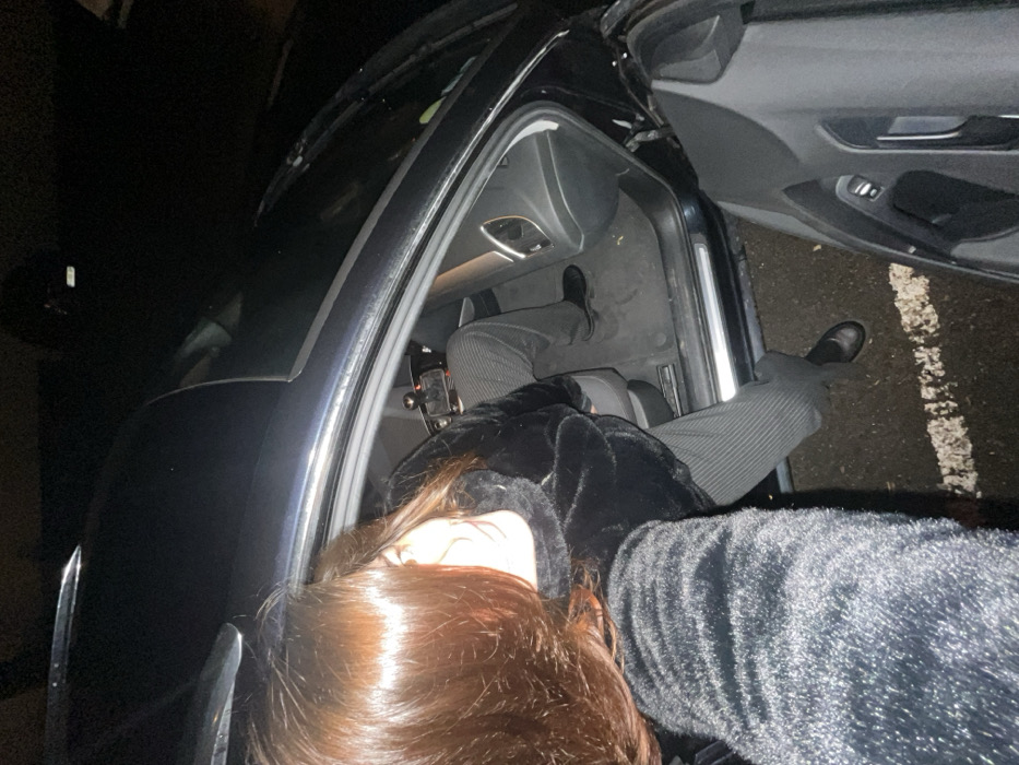 An unusual high-angle shot shows a woman leaning into the open doorway of a black car. Her head, with reddish-brown hair, is near the bottom. She's wearing a dark, possibly furry, jacket or coat. A person's legs, clad in grey pinstripe pants and black shoes, are visible in the car. Outside the open car door, a gloved hand and white painted parking lines can be seen on the asphalt. The lighting is dim.