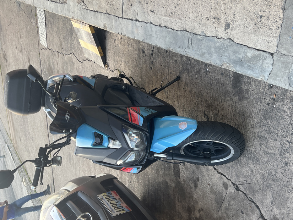 An image captured in Valencia, Carabobo state, Venezuela, depicts a parked two-tone scooter and a portion of a car on a cracked concrete surface