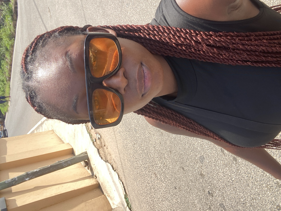 The image captures a close-up, chest-up selfie of a dark-skinned adult female standing outdoors on a paved road in Accra, Ghana. The female subject is centrally framed, looking directly at the camera. She wears oversized, rectangular sunglasses with dark frames and amber-tinted lenses, which reflect elements of the background. Her hair is styled in numerous reddish-brown box braids or twists, falling past her shoulders. She is dressed in a plain black sleeveless top or dress featuring a high neckline and subtle vertical seam detailing on the front. A dark strap, likely from a bag, is visible across her right shoulder. The background consists of a grey asphalt road extending diagonally from left to right. To the left of the road, a light orange-colored stucco wall is visible behind a concrete curb and an uneven dirt/gravel embankment. A grey utility pole stands upright between the road and the wall on the left. In the mid-distance on the road, a light-colored vehicle is present, and two indistinct human figures are observed walking away from the camera. Green foliage is visible beyond the road in the upper right background. The scene is brightly lit by direct sunlight.