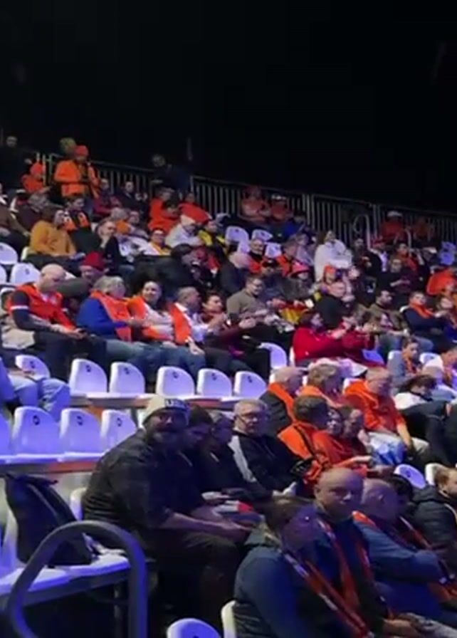 crowd of people in stadium seating, many wearing orange apparel. They are clapping, possibly in support of a team or performer. The seating is white and tiered, and the lighting suggests an indoor event. The crowd consists of diverse age groups and genders. In the foreground, some individuals are looking directly at the camera. The environment suggests a sporting event or performance, with the crowd displaying visible enthusiasm.