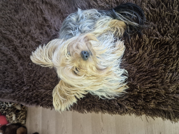 - "A Yorkshire Terrier is observed lying on a dark brown, shaggy rug" by FM-Trv662, licensed under CC BY 4.0