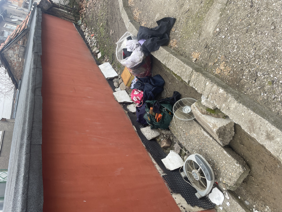The image depicts an outdoor scene in Vidin, Bulgaria, characterized by an accumulation of miscellaneous items alongside a building
