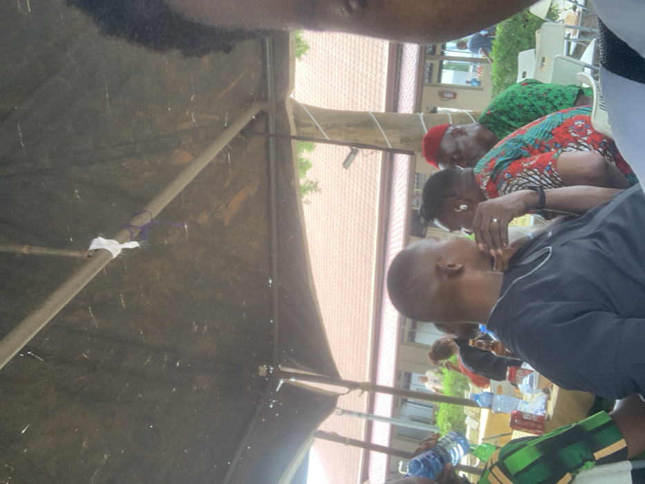The image depicts an outdoor social gathering in Ogbunike, Nigeria, observed from a low angle under a dark fabric canopy supported by metal poles