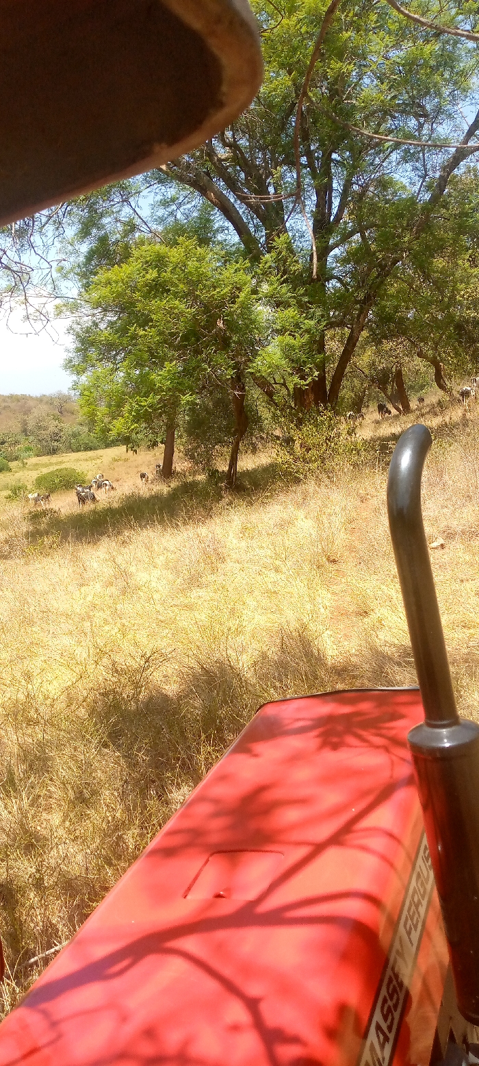 A field of dry, golden grass stretches across the scene, dotted with trees providing shade. A herd of goats graze on the hillside. The view is framed by the cab of a red Massey Ferguson tractor, with a black exhaust pipe visible on the right. Sunlight casts shadows across the tractor's hood, suggesting a bright, sunny day. A portion of the tractor's windshield frame is visible in the upper left.