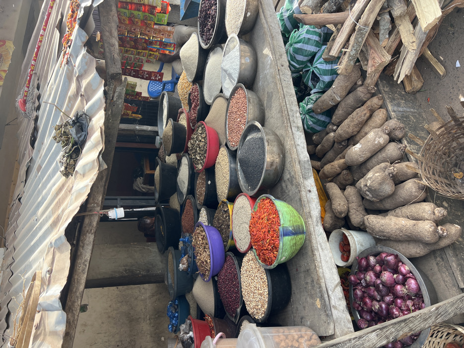 This image captures a market stall in Jos, Nigeria, operating under a corrugated metal roof supported by wooden beams