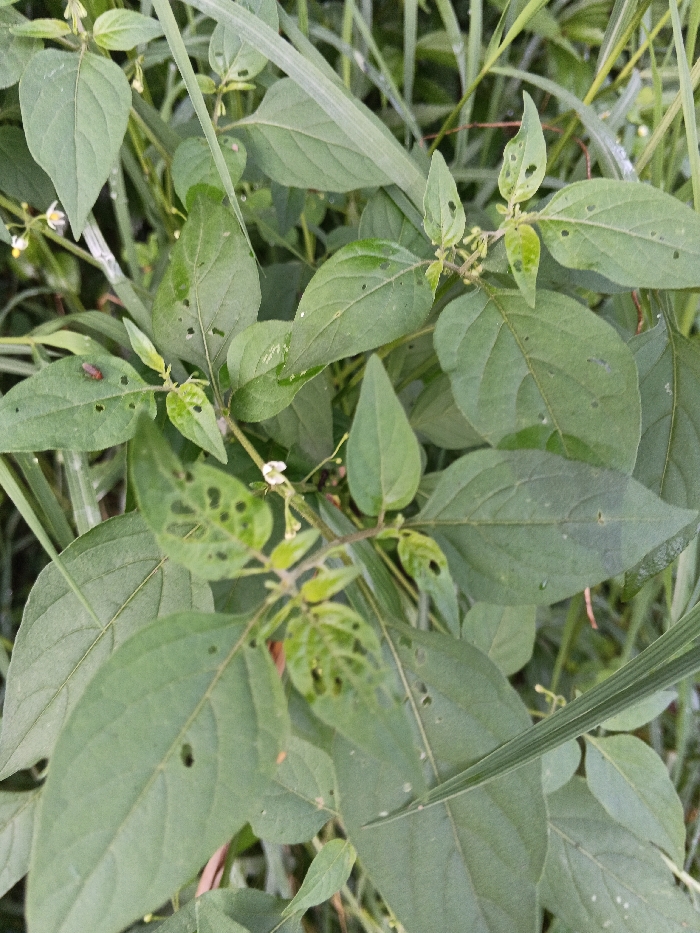 A close-up shot reveals a cluster of green plants, possibly weeds, with varying sizes and shapes of leaves. Small white flowers are scattered amongst the foliage. Many of the leaves display holes, indicating insect damage. Blades of grass intertwine with the other plants, and a small red insect is visible on one of the leaves. The overall composition suggests a natural, overgrown environment.