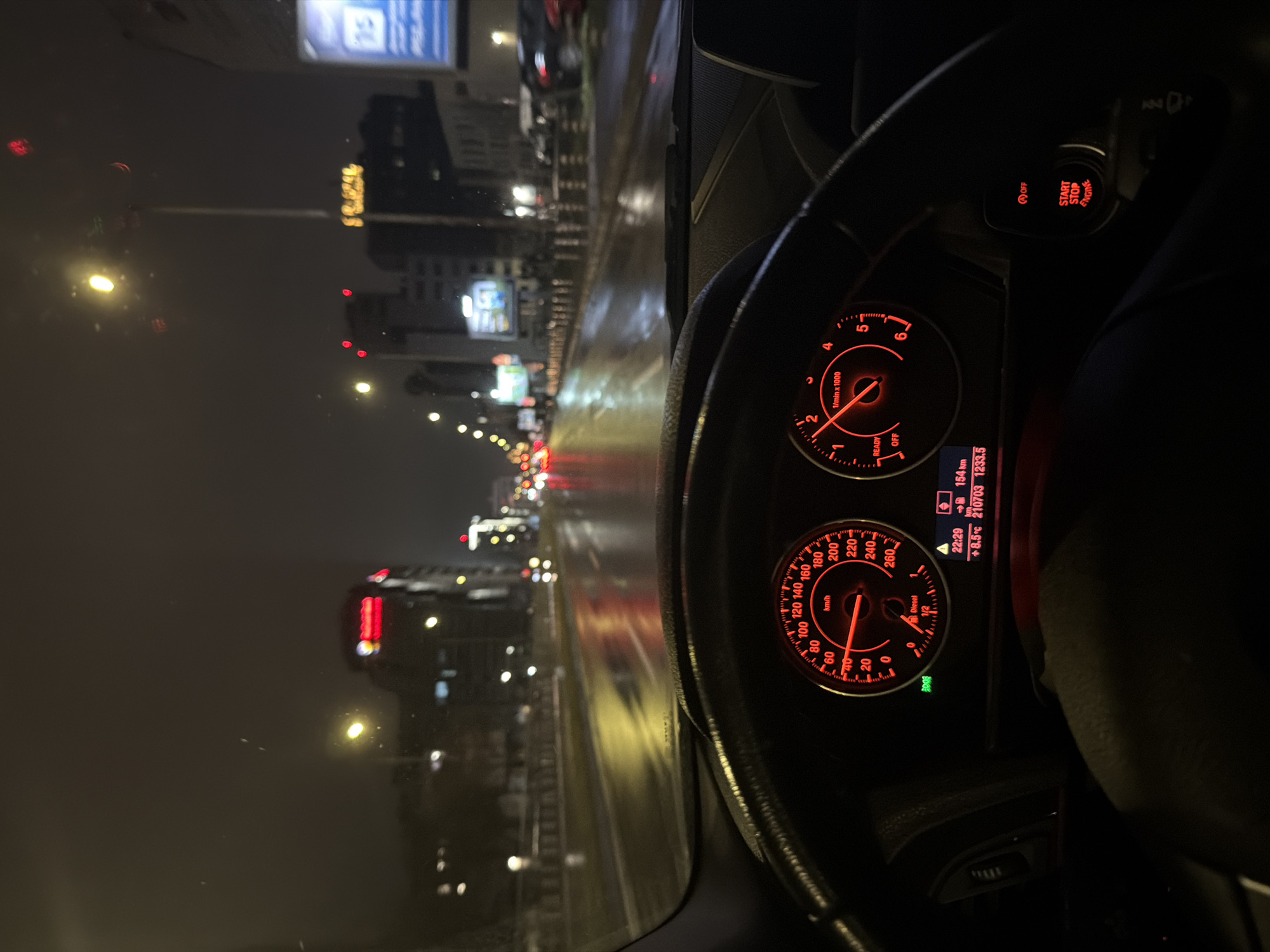 night scene from inside a car, likely in Sofia, Bulgaria. The dashboard is visible, displaying a speedometer reading around 100 km/h and a tachometer reading just above 1000 RPM. The ambient temperature is +8.5°C, and the odometer reads 1233.5 km. The car is a diesel model. The "START/STOP ENGINE" button is illuminated in red. Outside the car, the city streets are wet, reflecting the light from streetlights and buildings. The urban environment suggests Sofia, Bulgaria, with recognizable buildings and signage.