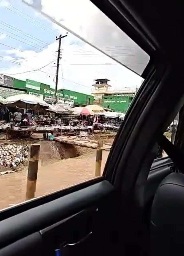 The video, shot from inside a car, shows a vibrant outdoor market. Numerous stalls are visible, covered with white umbrellas, suggesting protection from the sun. Vendors and customers can be seen moving around the market. The market is located alongside a road. A wooden bridge-like structure crosses a small ditch, which appears to be dry. The background reveals buildings, including one painted in green with the words "Safaricom M-PESA" on it. Utility poles with electrical wires are also visible. The sky is partly cloudy. The car appears to be moving slowly past the market.