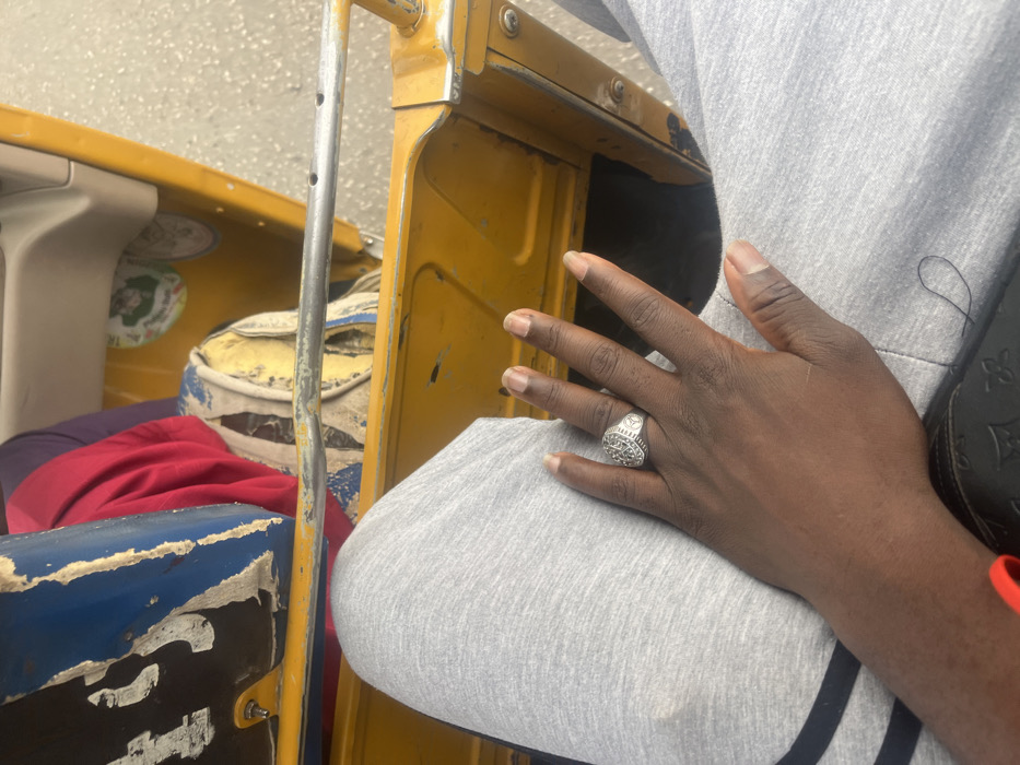 The scene is depicted from a first-person, elevated perspective within the interior of a yellow three-wheeled motorized vehicle, commonly known as a tricycle or "keke napep," located in New Stadium, Nigeria. The primary subject is the right hand and lower torso/legs of an individual with dark brown skin. The individual wears light grey sweatpants or joggers, featuring a black stripe along the outer seam of the left leg. A prominent, ornate silver-colored ring with a detailed circular or oval face is worn on the third finger of the right hand. The fingernails are natural and unpolished. A red fabric band or strap is visible near the lower left edge of the frame, possibly part of a shoe or accessory. The vehicle's interior features a worn blue and black panel on the left side, showing significant paint loss and chipping. A horizontal, silver-colored metal bar, displaying wear and minor corrosion, extends across the mid-ground. Behind this bar, various items are visible against the yellow interior: a vibrant red piece of fabric, a segment of purple fabric, and a light-colored, patterned textile. Two circular stickers are partially visible on the yellow wall behind these items. The ground outside the vehicle appears to be light grey asphalt or concrete, indicating an outdoor paved surface. The lighting suggests a bright, even daylight condition.