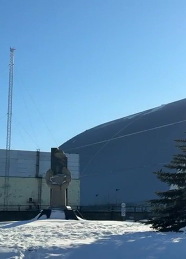 wide shot of the Chernobyl Nuclear Power Plant sarcophagus in winter