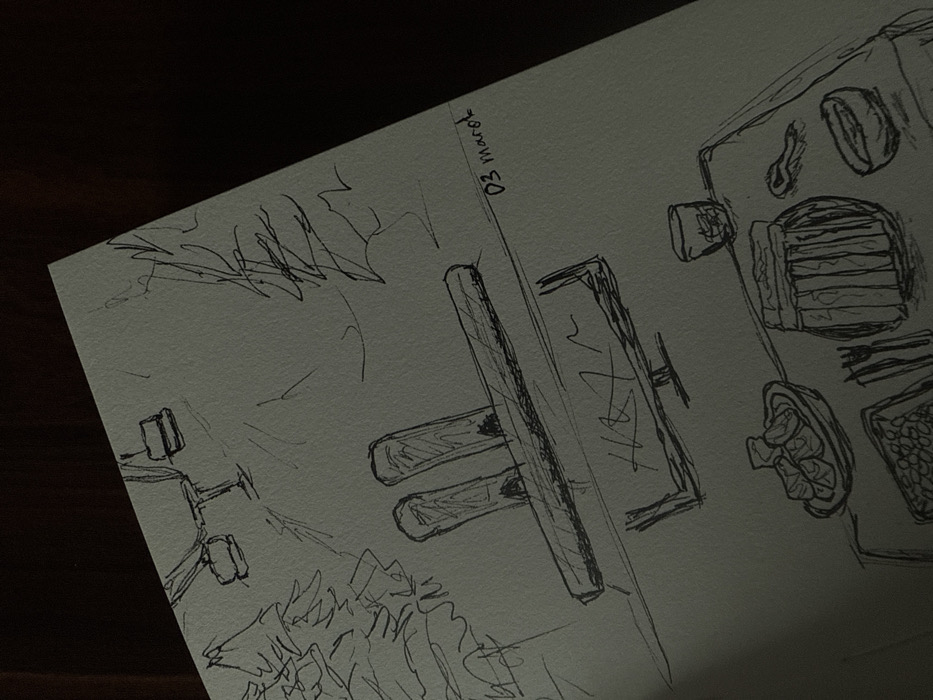 A hand-drawn sketch on light-colored paper, viewed obliquely under dim lighting, depicts two contrasting scenes: a winter mountain landscape and an indoor dining table