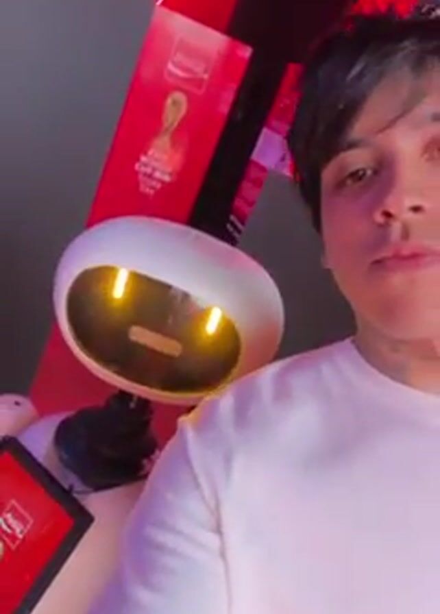 A young man with black hair and tattoos stands facing forward near a white robot. The robot is egg-shaped with two yellow lights on its face. It is holding a tablet with a Coca Cola ad for the FIFA World Cup. Behind the man and robot are red Coca Cola advertisements. A person in a red shirt walks by behind the robot.