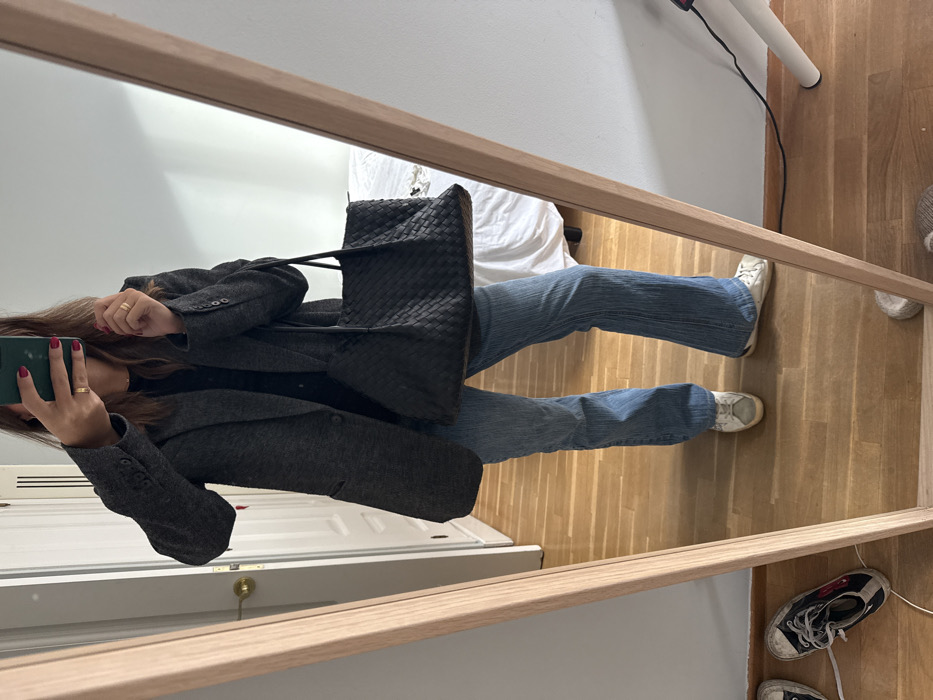 Location: Indoor residential setting, Unknown, Unknown. An individual is depicted taking a mirror selfie. The subject, visible from mid-chest to feet, wears a dark grey blazer over a dark top, light-wash blue flared jeans, and light-colored sneakers. Their right hand holds a green smartphone, obscuring their face, while their left hand holds a dark, woven leather tote bag. Dark red nail polish and a gold ring on the left ring finger are visible. The scene is reflected in a full-length mirror with a light wooden frame. The floor is light-toned wooden planking. In the background, a white door with a brass doorknob is visible left, and a white bed with white bedding right. A pair of dark sneakers with white laces and red heart patches, and a white cable, are on the floor adjacent to the mirror. A light-colored tripod is partially visible on the far right.