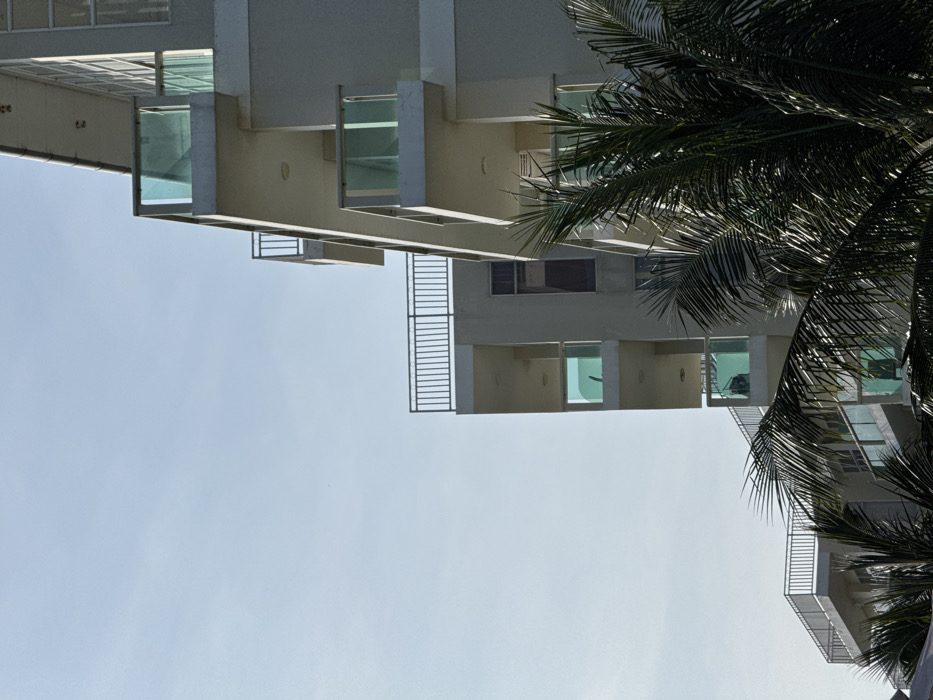The image captures a daytime scene in Unknown, Vietnam, dominated by modern multi-story buildings under a clear, light blue sky. The prominent structure on the right features a light-colored facade with several tiered balconies. The upper balconies are equipped with light-blue tinted glass railings, while balconies on the lower visible levels and on a building further to the left feature dark metal bar railings. Various windows are visible on the building exteriors; some appear dark, indicating interiors, while others reflect the sky. Dense green palm fronds are positioned in the foreground and midground, partially obscuring the lower and central sections of the buildings. No individuals or discernible activities are present.