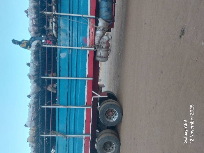 A truck, painted blue and red, is heavily laden with livestock. Numerous sheep or goats are crammed into the back, some even spilling onto the roof of the truck. A man in a yellow shirt is precariously perched atop the animals. The truck is parked on a dirt road, suggesting a rural setting. The photo was taken with a Galaxy A52 on November 12, 2025.