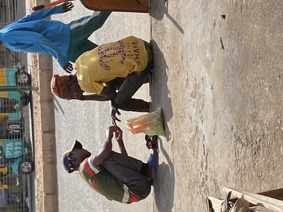 The scene depicts an outdoor interaction on a sunny day in Bukuru, Nigeria