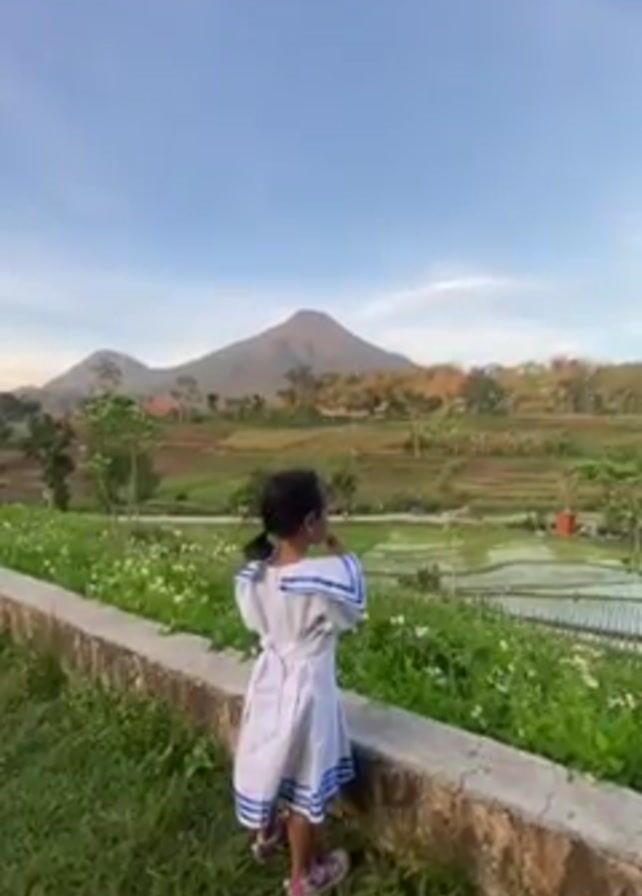 small child, viewed from the rear, standing next to a low stone wall. The child has dark hair in a ponytail, is wearing a white dress with blue stripes, and pink sandals. In the background is a landscape featuring rice paddies and a mountain. The child points at something in the distance, then puts something in their mouth. The weather appears clear.