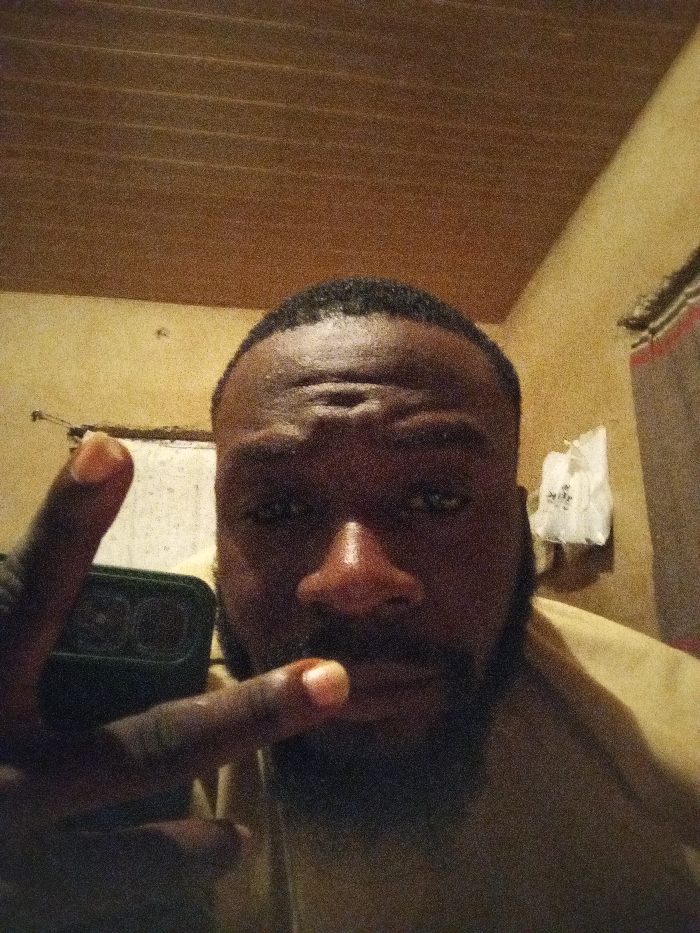 The image depicts a close-up selfie of an adult male in an indoor setting in Agban, Nigeria