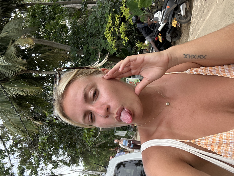A selfie-style image features a fair-skinned woman with blonde hair pulled back. She's wearing a light-colored patterned top and a delicate gold necklace. She is sticking her tongue out and touching her face. A tattoo is visible on her left forearm. In the background, there are palm trees, various green plants, and a scooter parked. A person sits on the scooter and the sidewalk. The image is somewhat rotated to the left.