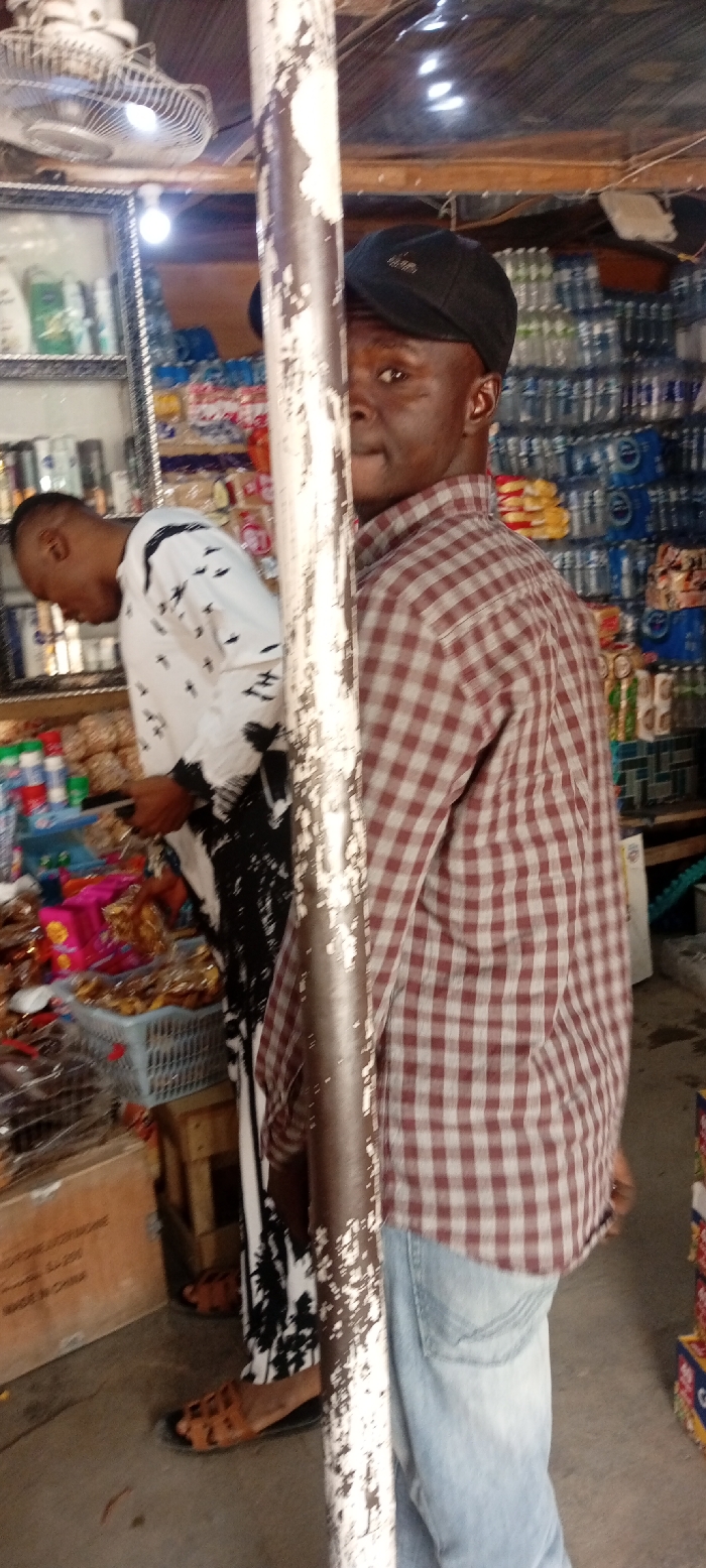 The scene is an indoor retail space within the city of Aviation Quaters, Nigeria, resembling a small shop or market stall