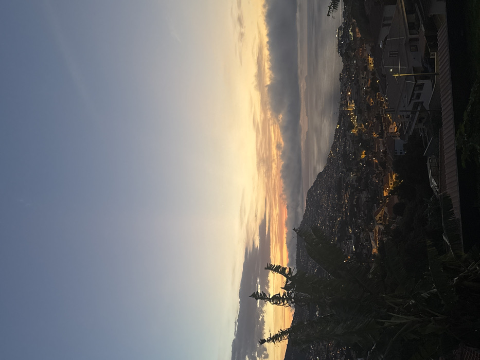 An urban landscape nestles on a steep hillside, transitioning from daylight to twilight. Warm light emanates from clustered buildings, contrasting with the darkening sky. A gradient of colors streaks the horizon, from blues and yellows to oranges, suggesting either sunrise or sunset. A vertical band of clouds complements the color transition. In the foreground, a large, dark palm or banana tree obscures a portion of the view.