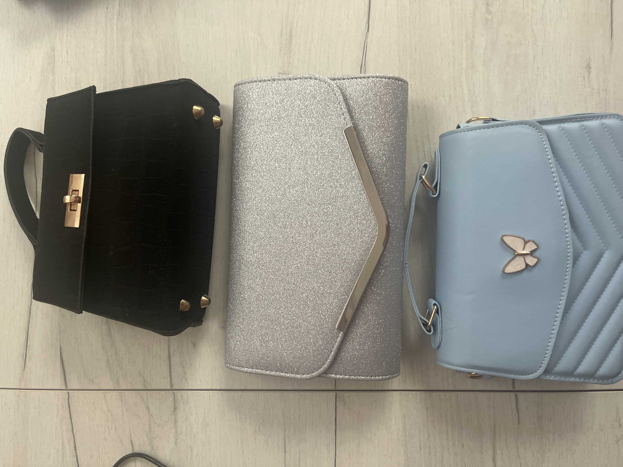 Three handbags are arranged side-by-side on a light-colored, tiled surface. From left to right, the first handbag is black with a short handle and gold-colored hardware including a clasp and decorative studs. The second handbag is silver and rectangular with a slanted metal accent. The third handbag is light blue with a quilted design, a metal butterfly decoration, and gold-colored hardware for the handle attachment. The location is unknown and there is no indication of Klisura, Bulgaria. No people, actions, or interactions are depicted.